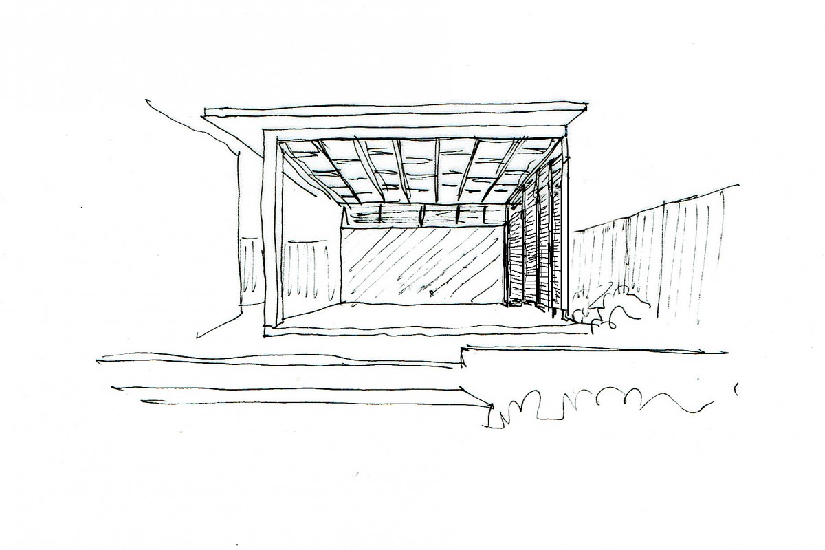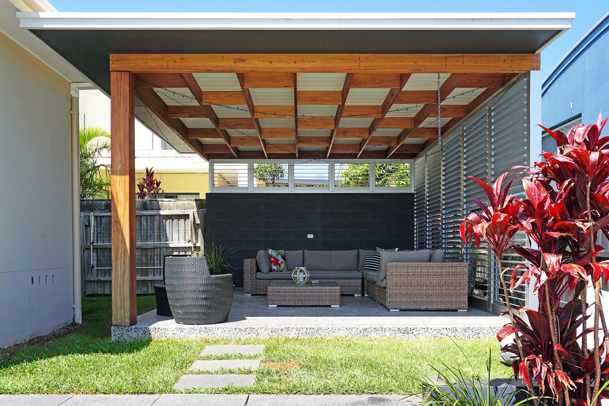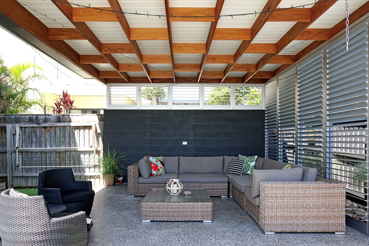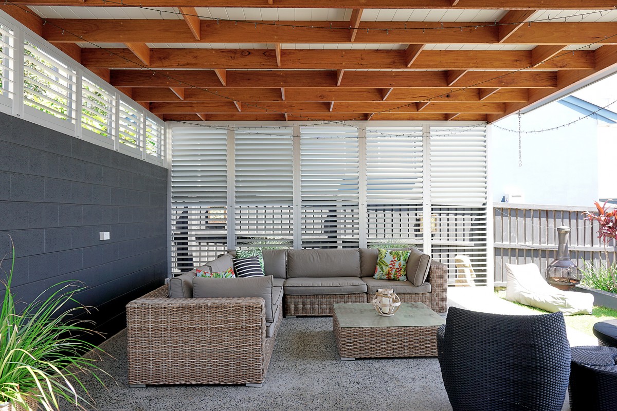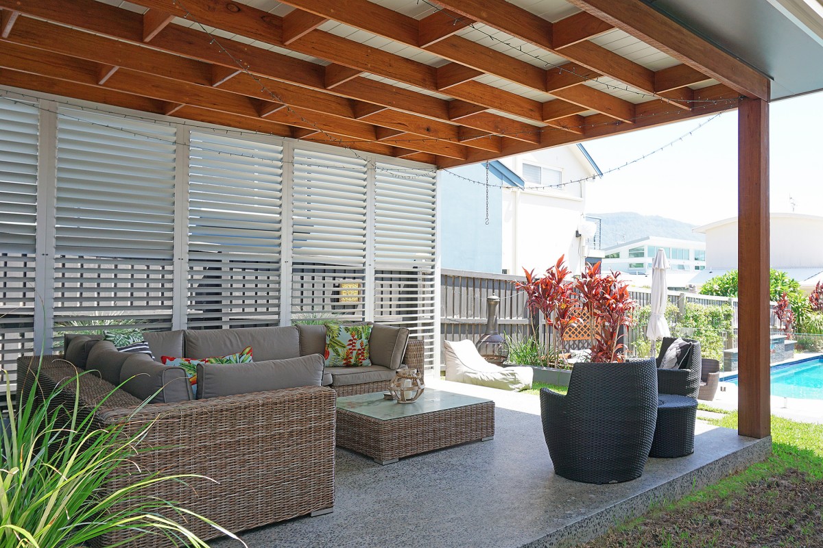 Covered Outdoor Entertaining. The brief for this project was to make use of an elevated portion of the yard to locate a 25 sqm pergola overlooking an existing pool. A hardwood designed staggered grid & v-joint style ceiling lays above concrete floors whilst a painted block wall and metal shutters provide controlled natural light and privacy. Simple & Elegant.